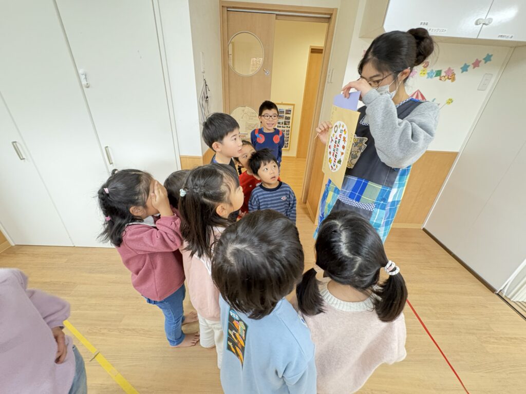 アブラカタ~ブラかたぶらぶーらと歌いながら体を動かしたり、「毛、毛、毛、毛、毛が〇本~♪」という動きから、鼻毛が「ボオッ!」と伸びたり、まつ毛が「ポロッ」と落ちたりする場面は、子どもたちも大笑いしていました😄✨