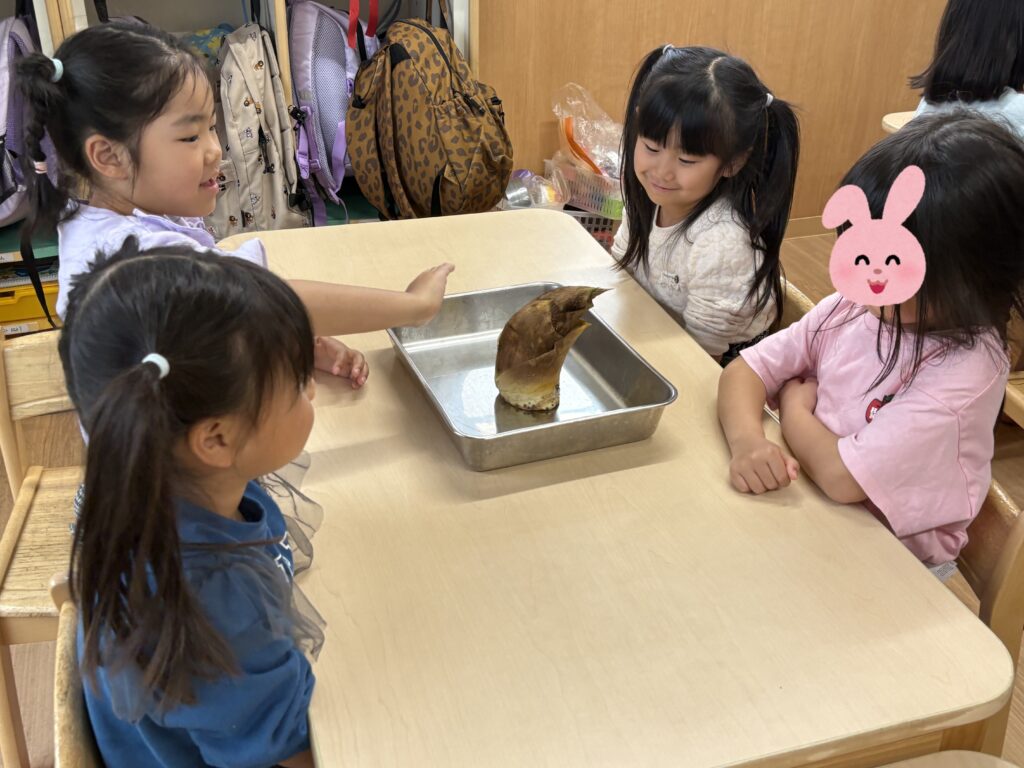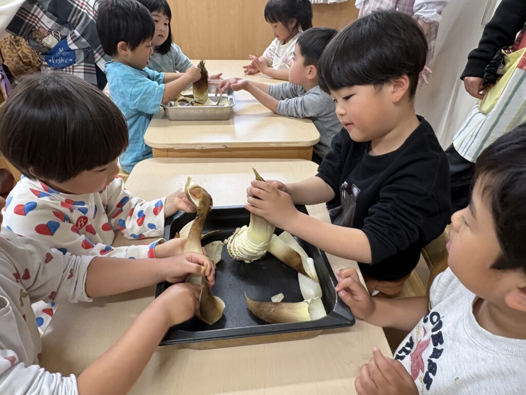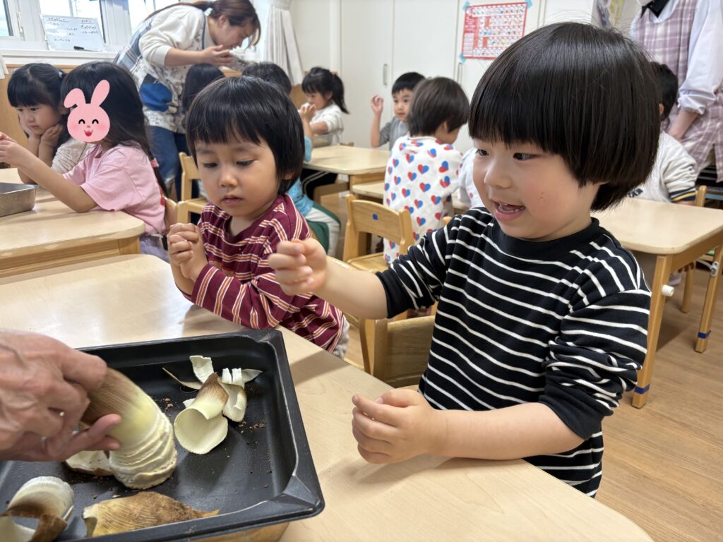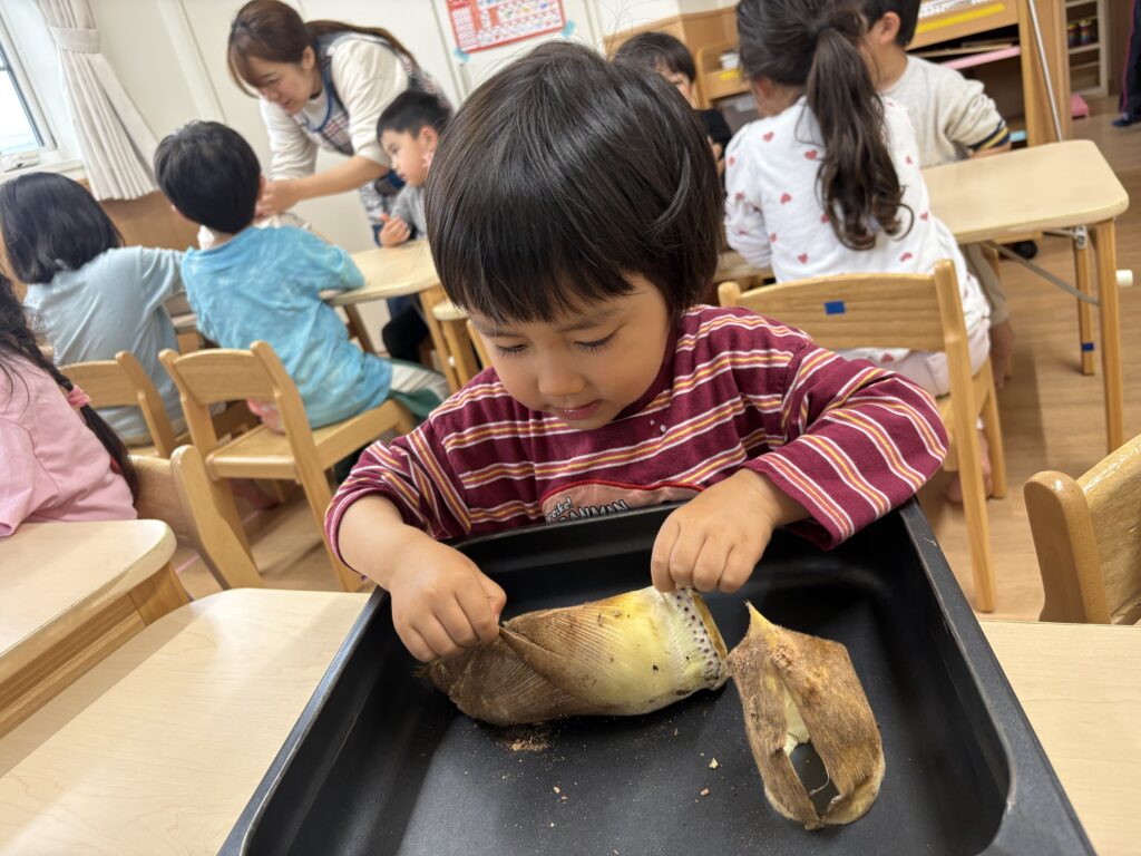 たけのこはいくつもの皮で包まれています!一枚一枚皮を剥いてみましょう🤗