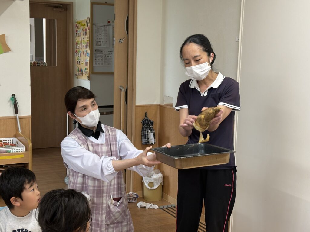 子どもたちが剥いてくれたたけのこは、後日『たけのこご飯』としてお給食に出るそうです😊✨